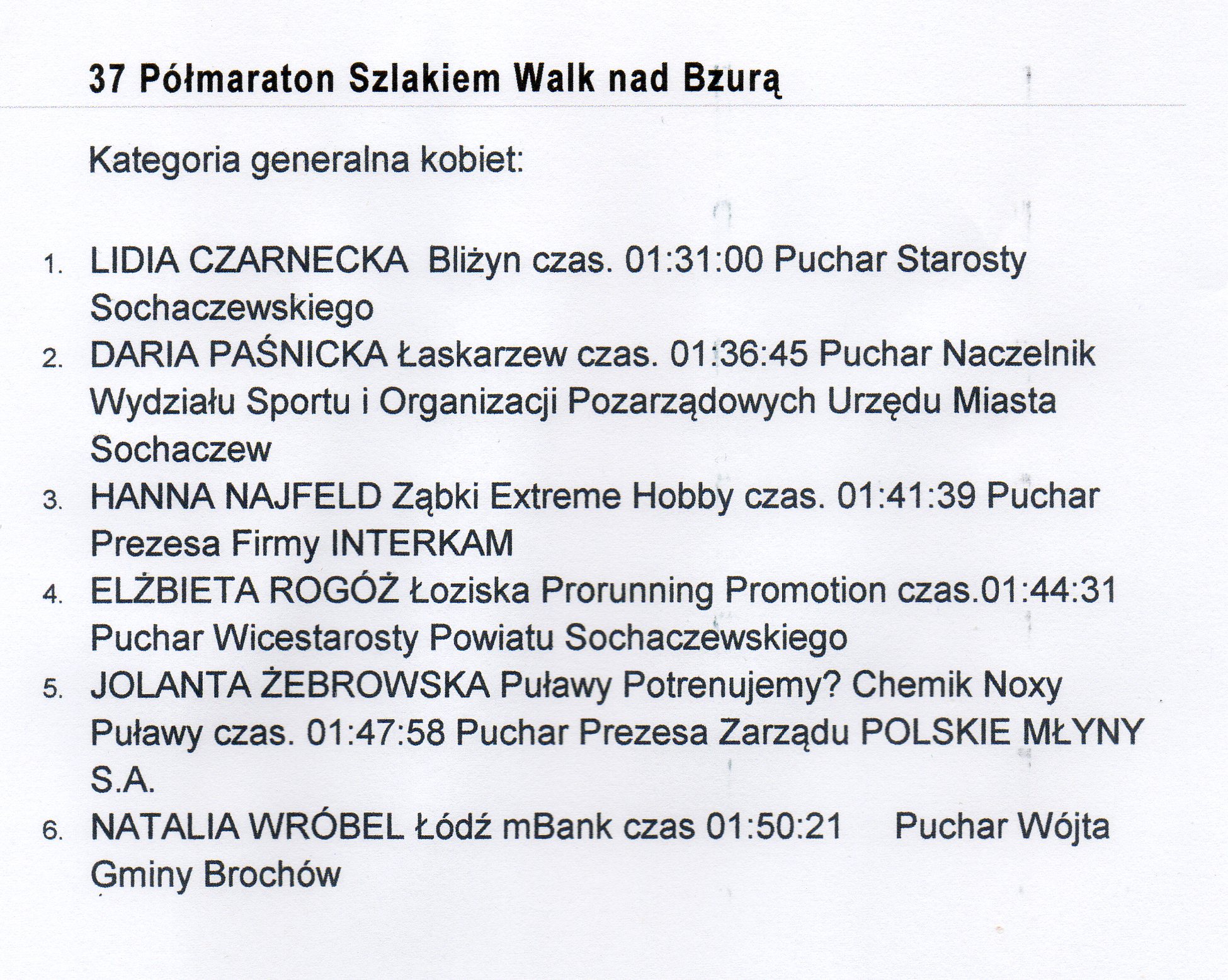 Trasa wynosząca 21,0975 km wiodła z miejscowości Kamion Poduchowny do Sochaczewa. Nasza zawodniczka Jolanta Żebrowska wystartowała tym razem w kategorii generalna kobiet, zajmując w doborowym towarzystwie piąte miejsce, uhonorowane pucharem Prezesa Zarządu POLSKIE MŁYNY S.A.