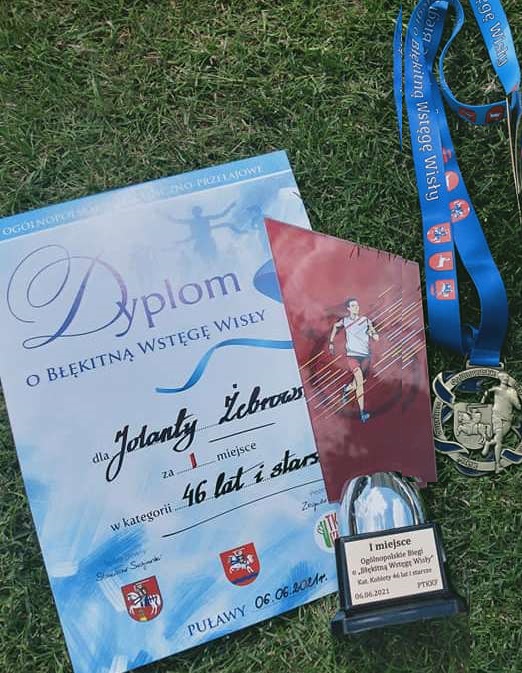 Za to w niedzielę 6 czerwca można było pobiegać na miejscu, albowiem w Puławach odbyły się tradycyjne biegi „O Błękitną Wstęgę Wisły”. Oczywiście na starcie, na którym stanęło ponad 200 uczestników w 12 kategoriach, nie mogło zabraknąć pani Joli, która podtrzymała dobrą passę, zajmując w biegu głównym na 10 km pierwsze miejsce w kategorii 46 plus.