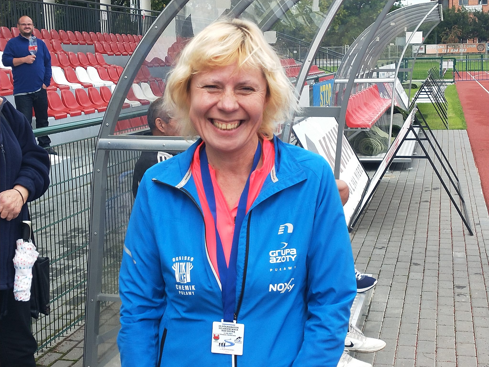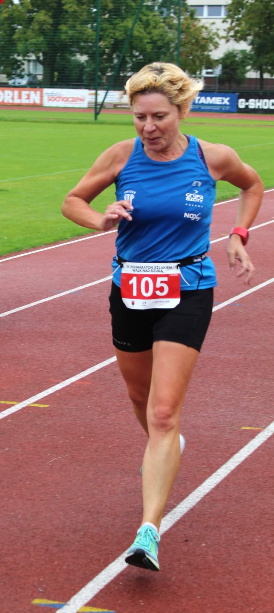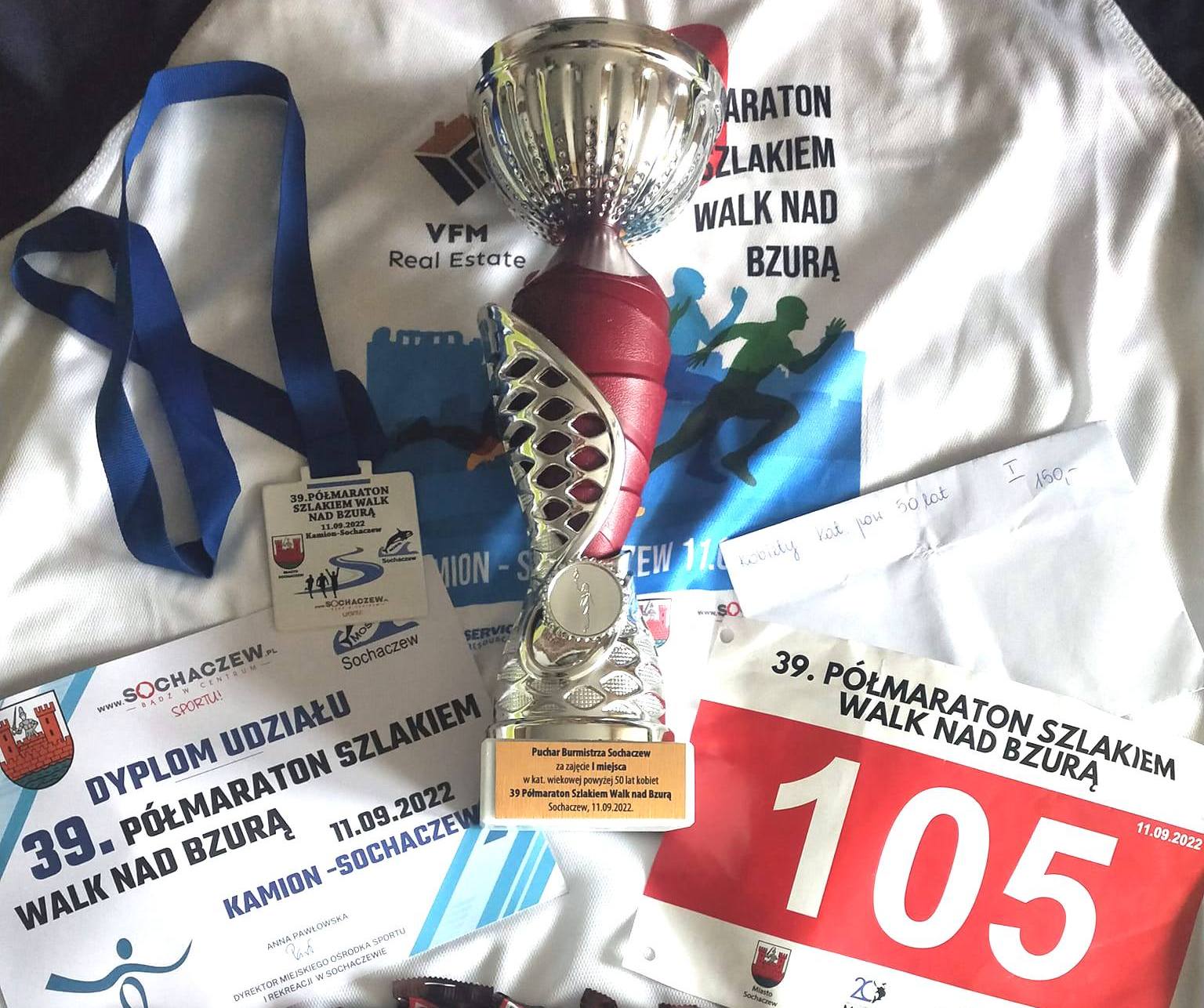 „11.09.2022, 39. Półmaraton Szlakiem Walk nad Bzurą Kamion - Sochaczew, 1 miejsce w kategorii wiekowej. Łatwo nie było. Wybrałam się w podróż 182 km sama. Samochód po awarii porzucony w pół drogi do Sochaczewa. Szybka decyzja: stopem. Teraz wiem, że to szaleństwo. Czasu na styk, ryzyko, ale opłacalne. Co lepsze to nie zakodowałam miejsca pozostawienia auta. No wiedziałam, że ujechałam 99 km i do Sochaczewa zostało 83 km. Powrót nie dawał mi spokoju podczas biegu, do tego poczułam ból stopy i jakieś skurcze łydki. Cóż. Zacisnęłam zęby i wszystko poszło gładko. Na pewno na długo zapamiętana podróż i start.”