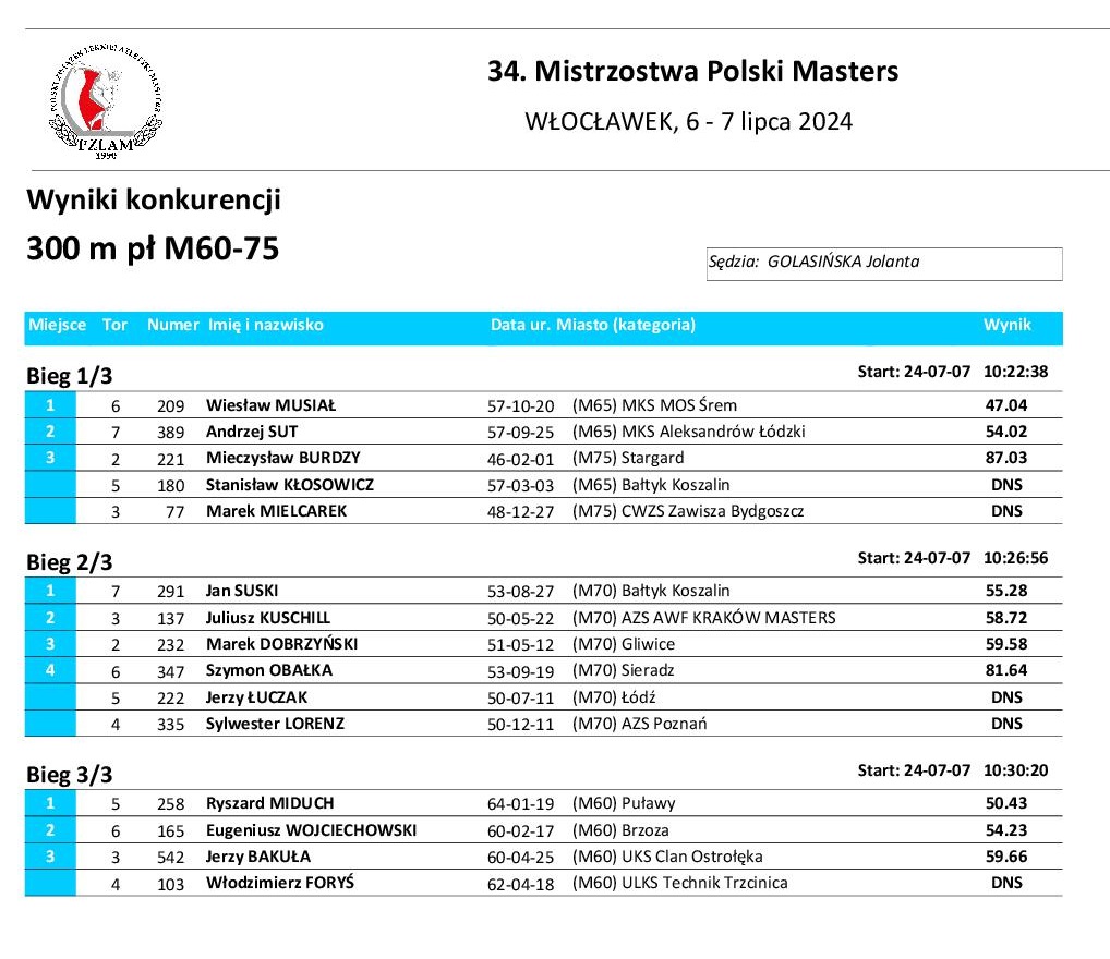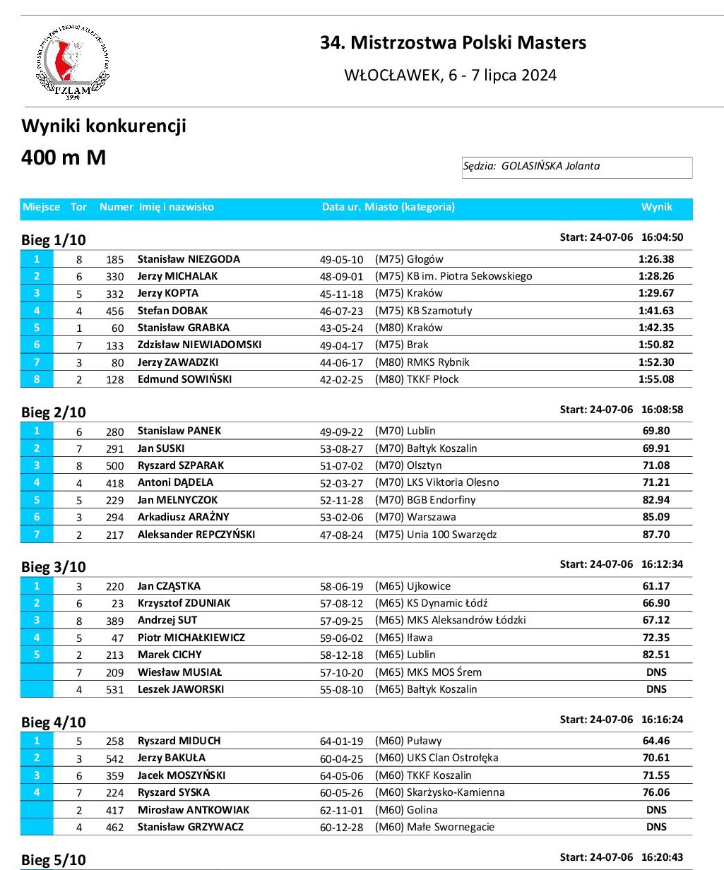 Jednym z uczestników będzie Ryszard Miduch, reprezentujący barwy Ogniska TKKF Chemik. Póki co, kol. Ryszard wystartował w 34 Mistrzostwach Polski Masters, które odbyły się w dniach 6 – 7 lipca we Włocławku. Mistrzostwa Polski Mastersów, czyli osób powyżej 35 roku życia, to zawody, wśród których między amatorami startowało wielu olimpijczyków, wśród nich medaliści olimpijscy. Na tegoroczne zawody zgłosiło się 570 osób powyżej 35 roku życia. Najstarsze zgłoszone kobiety liczyły ponad 85 lat, a wśród mężczyzn znajdowali się zawodnicy w wieku ponad 90 lat. Kategorie wiekowe zostały podzielone co 5 lat. Podczas dwudniowych zmagań każdy zawodnik mógł startować w kilku konkurencjach. Skorzystał z tego nasz zawodnik, który wystartował w dwóch konkurencjach: 300 m przez płotki i 400 m płaskie, zdobywając w obydwu, w kategorii M60, złote medale. Gratulujemy sukcesu i czekamy na powtórkę w Göteborgu.